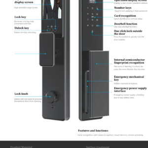 This smart lock supports 5 unlocking methods — including remote app control via Tuya Smart Life, Face recognition, password, card access, and mechanical keys. Equipped with a Grade C safety lock cylinder, it offers maximum resistance against break-ins.